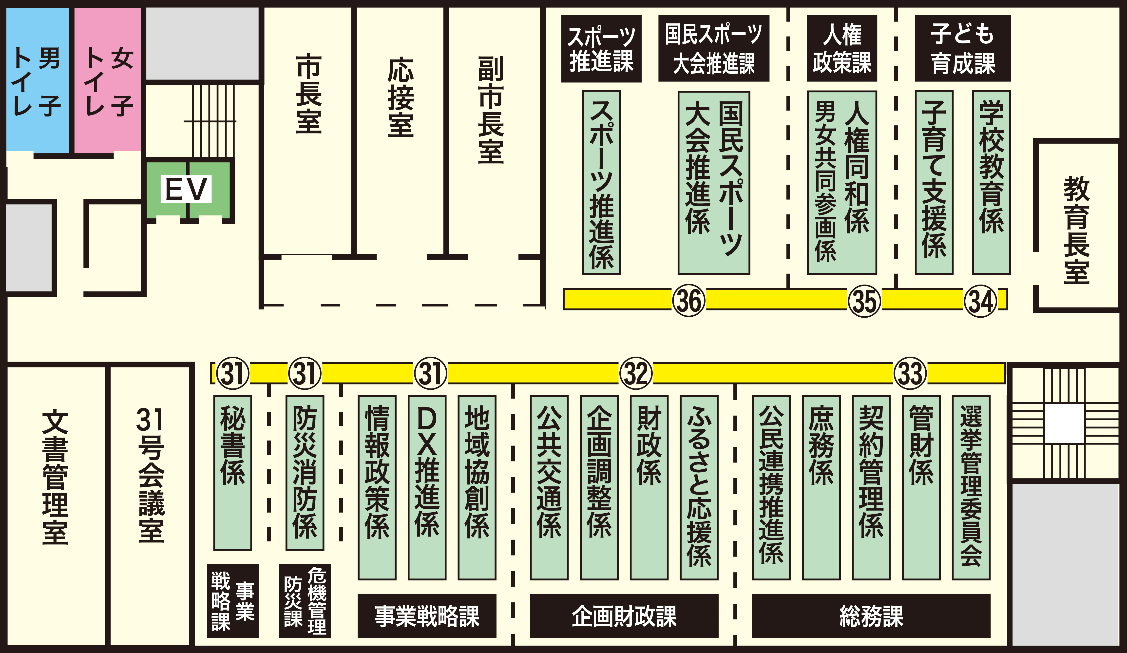 企画調整係、財政係、ふるさと応援係