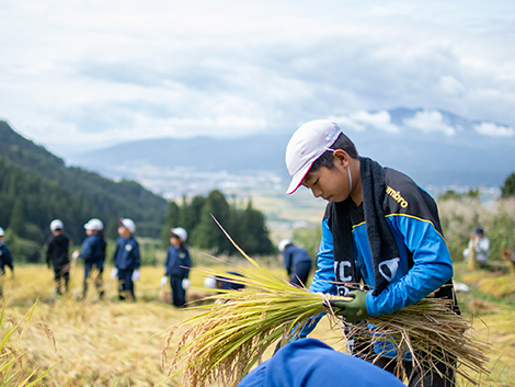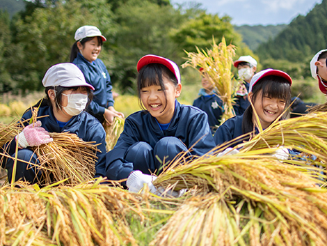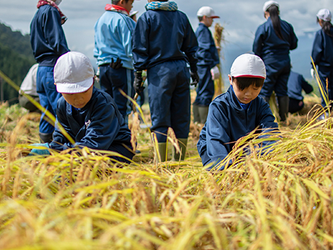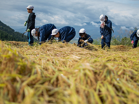 稲刈りは昔ながらの手刈りで行われ、稲を天日干しするはぜかけ作業も行い、地元の小学生たちは自分の体と同じほどの大きな稲の束を一生懸命はぜにかけていました。