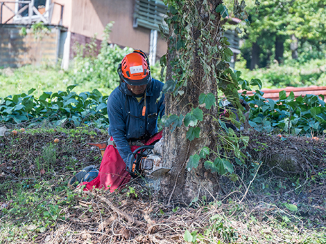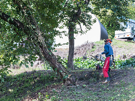 令和7年(2025年)9月25日、飯山市クマ被害防止対策事業の一環として、市内小境区の柿木の伐採を行いました。この取り組みは、ツキノワグマの出没による人身被害および農作物被害を防ぐことを目的とし、クマの誘引物となる果樹木の伐採またはトタン巻にかかる経費を補助する、今年度より開始した新たな取り組みです。9月25日現在、これまでに50本の果樹木が伐採され、さらに2件のトタン巻きが実施されています。