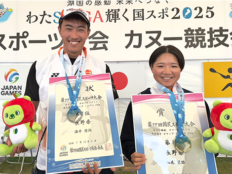令和7年(2025年)10月3日から滋賀県東近江市で開催されている「2025わたSHIGA輝く国民スポーツ大会」のカヌースプリント競技で、長野県競技力向上対策本部所属で飯山市に籍を置く酒井悠弦(ゆいと)選手と細見茉弥(まや)選手が活躍しました。酒井選手はカヤックシングル500メートル(10月4日)と200メートル(10月6日)で入賞、細見選手は、カヤック500メートルと200メートルの両競技で優勝し、MVPを受賞されました。おめでとうございます。