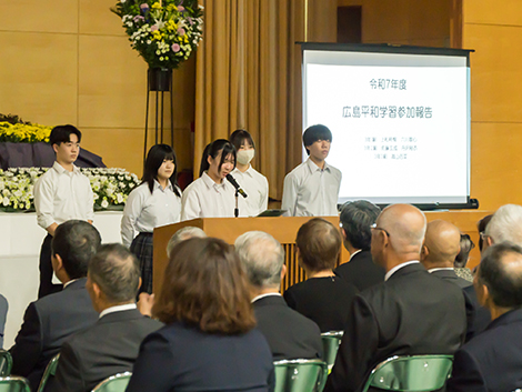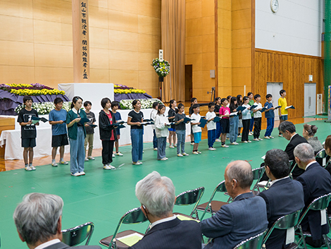 令和7年(2025年)10月8日、飯山市戦没者・開拓殉難者追悼平和式典を飯山市農林漁業体験実習館トピアホールで開催しました。第1部の式典では、全参列者による黙とうや献花が行われ、第2部では、市内中学生による広島平和祈念式典参加体験の発表や満蒙開拓団学習の発表が行われました。また、飯山小学校と木島小学校の児童による合唱の披露や、会場の皆様による合唱も行われました。