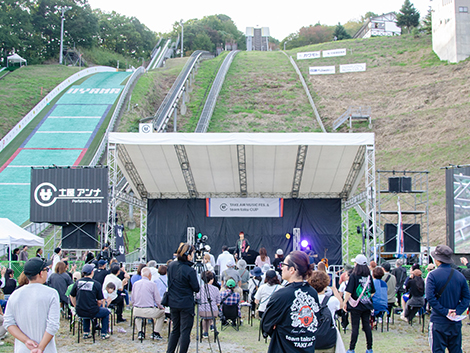 令和7年(2025年)10月12日から13日にかけて、スキージャンプのオリンピックメダリストで、地域おこし協力隊の竹内択選手が率いるteamtakuが、音楽とスポーツを融合させたイベント「TAKE AIR MUSIC FES.& teamtakuCUP2025」を、飯山シャンツェで開催しました。12日には、土屋アンナさんをはじめとする豪華アーティストによるライブパフォーマンスが披露され、会場は盛り上がりました。13日のteamtakuCUPでは、市内外から参加した小中学生によるスキージャンプ競技が行われたほか、昨年に引き続き、竹内択選手に加え、北京五輪で金・銀メダルの小林陵侑選手、ソチ五輪で個人銀メダルの葛西紀明選手などによるトークショーも行われました。