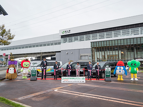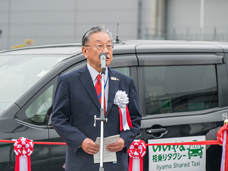 令和7年(2025年)10月15日、「いいやま相乗りタクシー」実証実験のオープニングセレモニーをJR飯山駅千曲川口広場で開催しました。「いいやま相乗りタクシー」は令和7年度(2025年度)日本版MaaS推進・支援事業による取り組みの一環で、市内の高齢者をはじめとする交通難民や観光客に向けた二次交通の課題を解消することを目的としています。この実証実験は、令和8年(2026年)1月31日まで行われます。