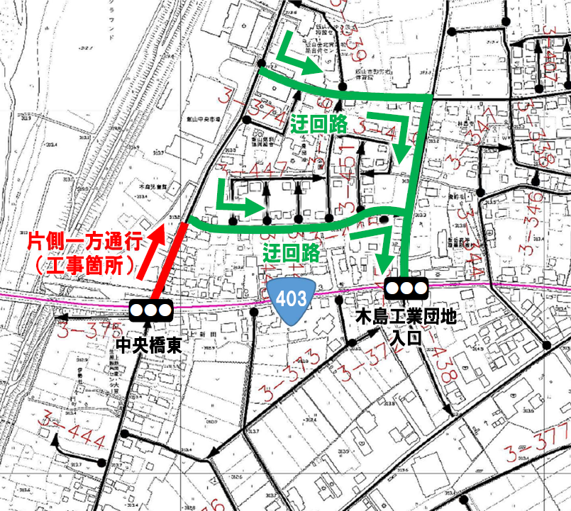 | 市道3-121号 |  中央橋東交差点〜木島児童館付近 片側一方通行