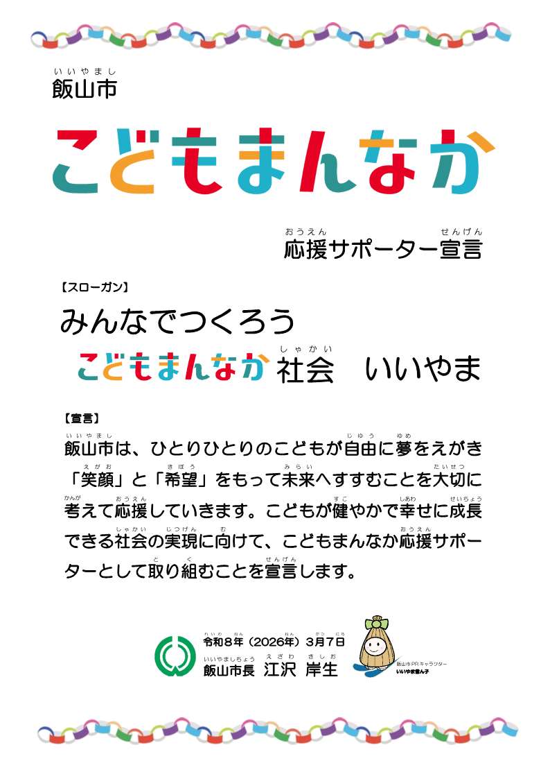 飯山市は、こども家庭庁が推進する「こどもまんなか」の趣旨に賛同し、こどもまんなか社会の実現に向け、令和8年3月7日に「こどもまんなか応援サポーター」として活動することを宣言いたしました。
