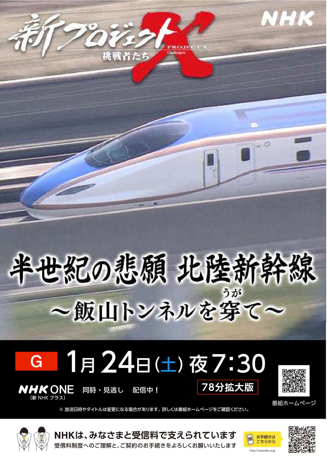 NHK番組「新プロジェクトX 挑戦者たち」で、北陸新幹線開業に向け、日本の土木技術の粋を結集して攻略完成した「飯山トンネル」をテーマに取り上げられる予定です。是非ご覧ください