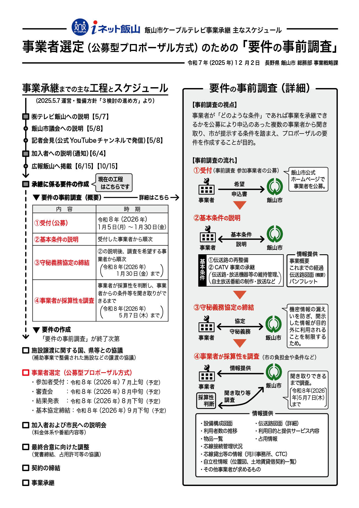 令和7 年(2025 年)5 月に飯山市ケーブルテレビ事業の民間事業者への事業承継について検討を行うため【飯山市ケーブルテレビ事業の今後の運営・整備方針】を公表しました。同事業の現状や課題を踏まえ、事業承継について検討するに至った経過は【事業承継検討に至った経過】をご覧ください。