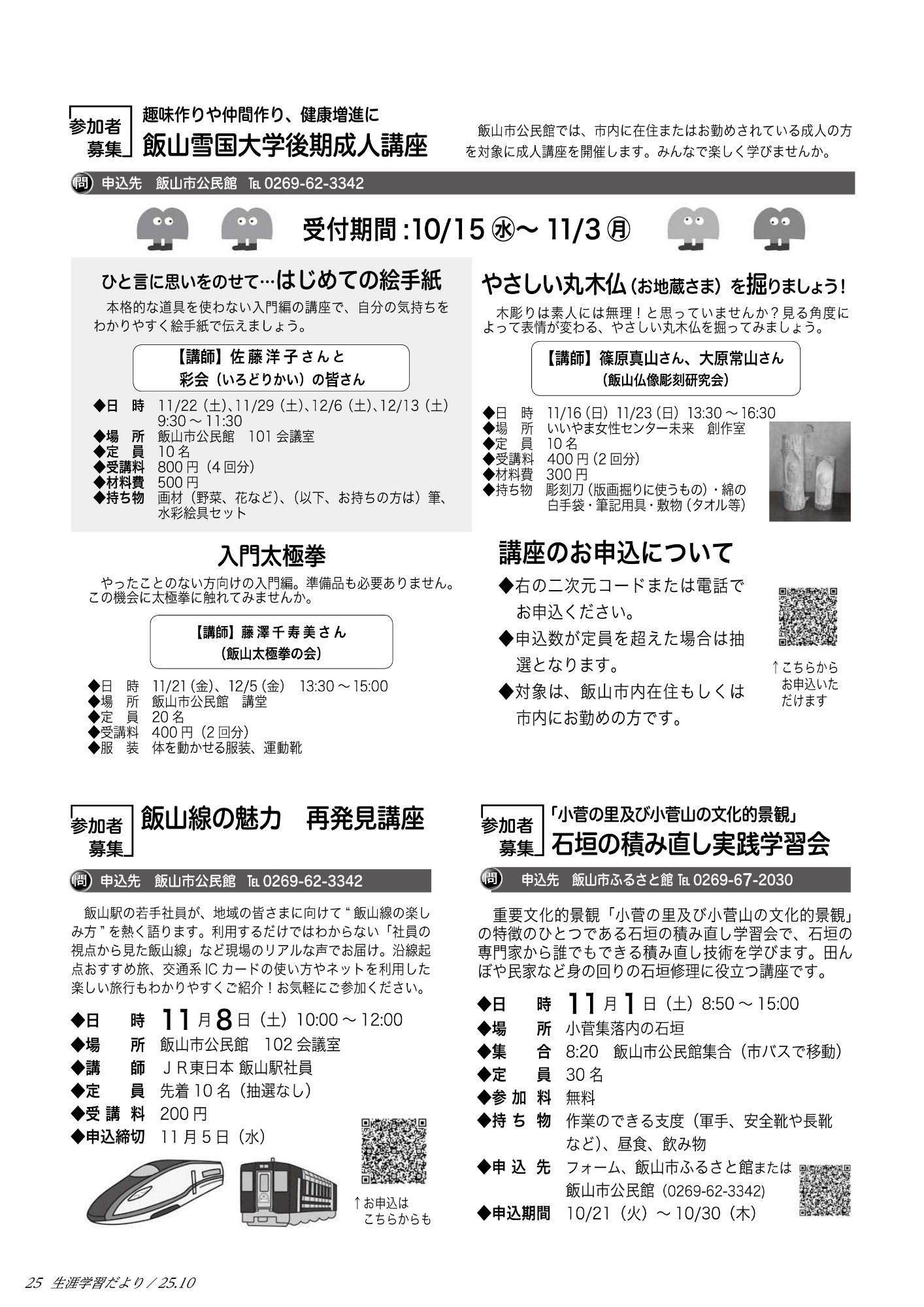 ◆申し込みは、飯山市公民館へ電話(℡0269-62-3342)または下記フォームからお申込ください。(小菅の石垣講座はふるさと館 ℡0269-67-2030からも申込可能です)