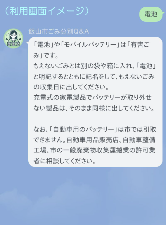 どう分別すればよいか分からないごみ、出し方が分からないごみを入力して送信すると、分別の仕方や出し方を自動応答でお答えします。