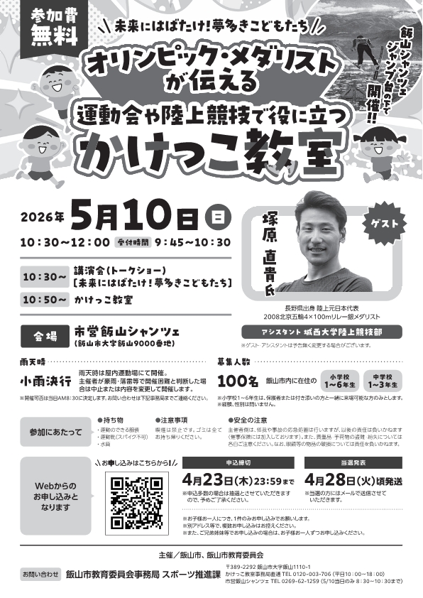 今回は、連携協定後、初めてとなるイベントとして、かけっこ教室を開催します。市内小学校1~6年生は保護者と一緒に参加できる方、中学校1~3年生はどなたでも参加可能であり、初心者や走るのが苦手な方も大歓迎です。