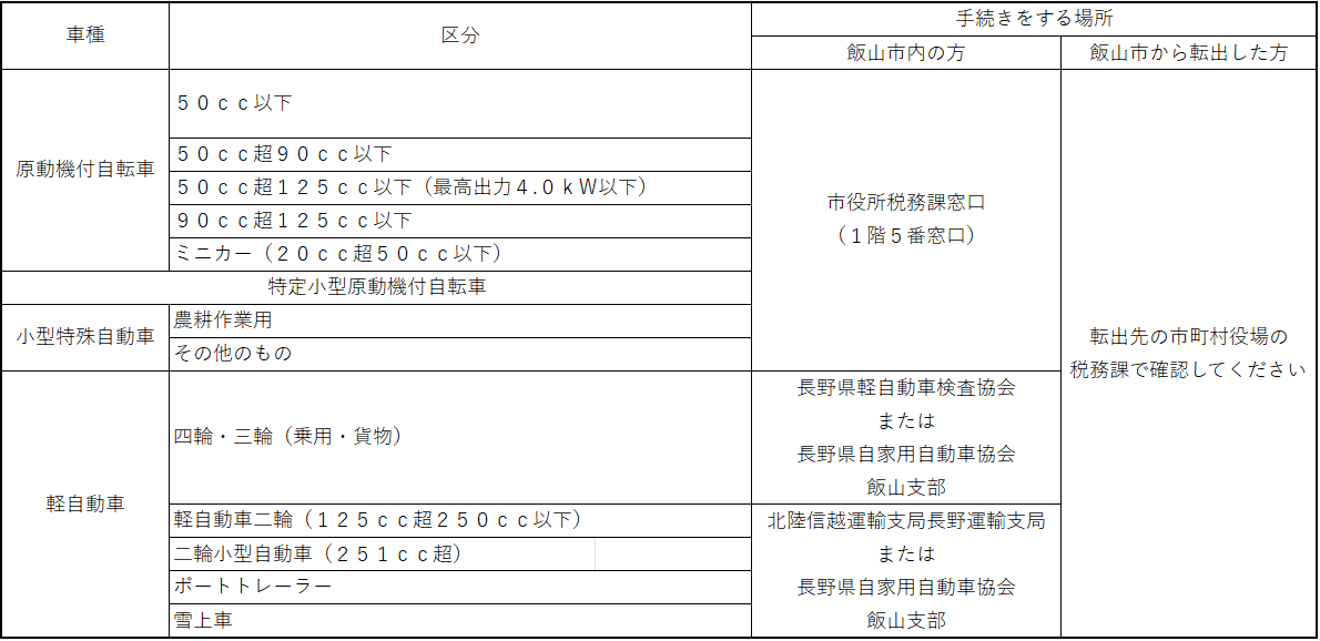 それ以外の車両については、下記の表をご覧いただき、所定の場所にて手続きしてください。