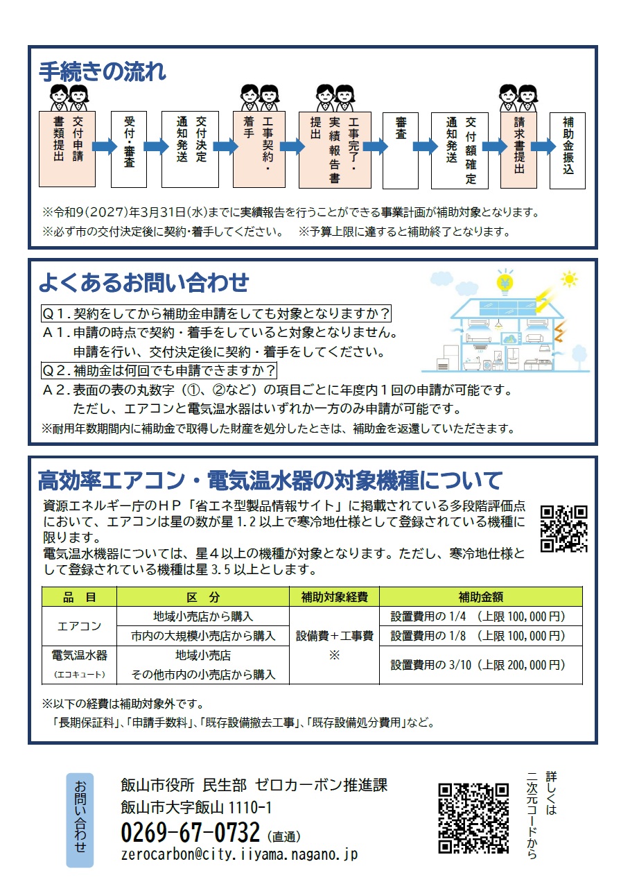・この補助金を利用するためには、事前に交付申請を行い、交付決定を受けた後に着手する必要があります。購入後(工事着手後)の申請は、原則として受け付けられませんので、ご注意ください。また、補助の対象となる製品等には条件がありますので、各事業の要件についてご確認いただき、ご不明な場合はお問い合わせください。